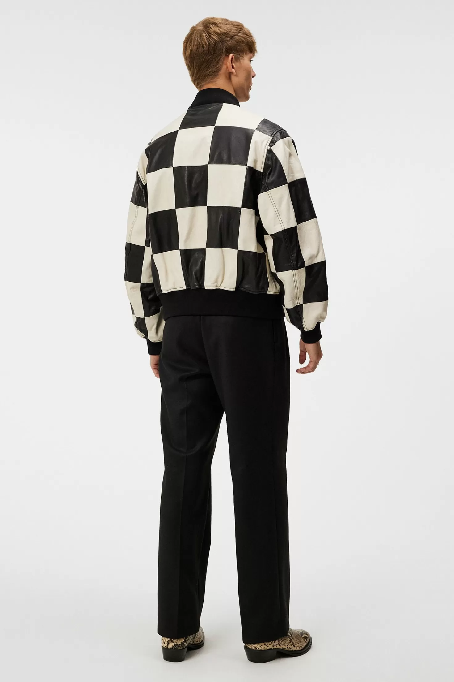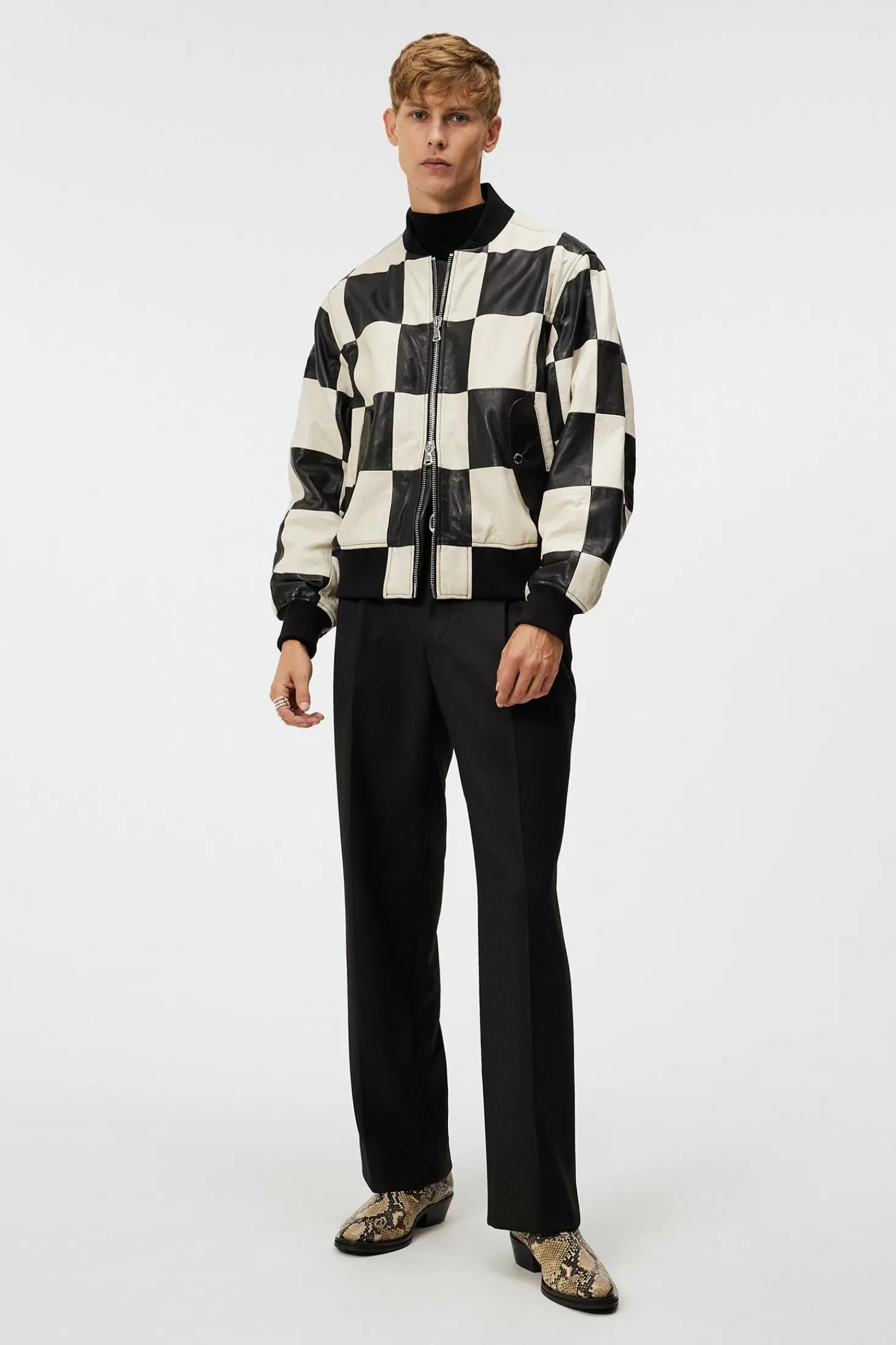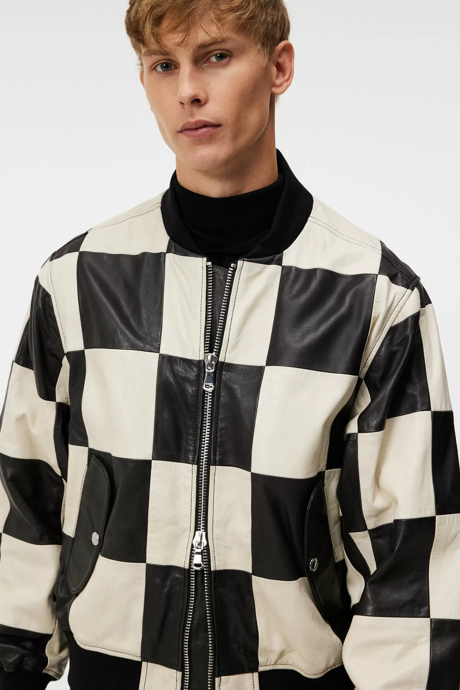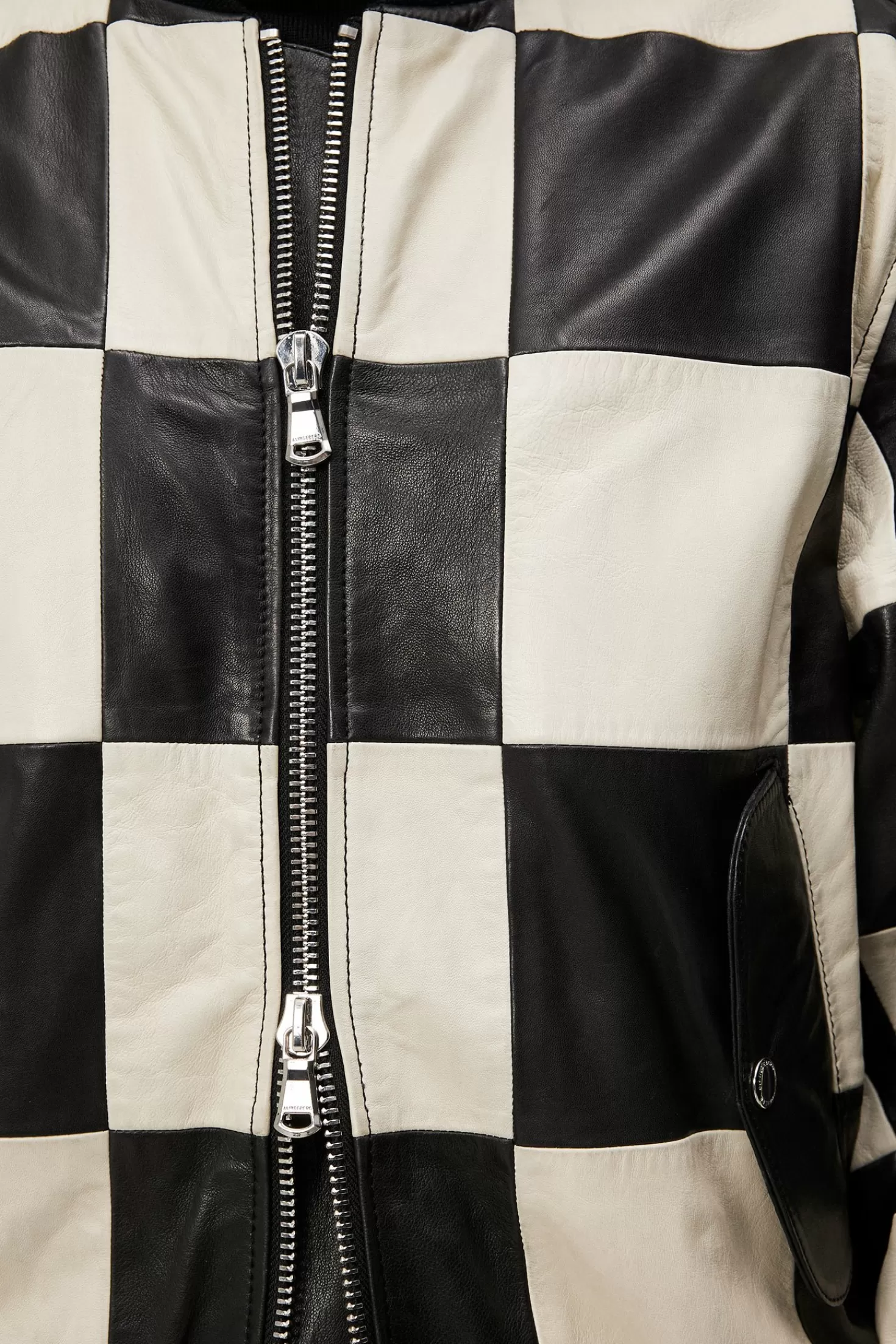 Den Ikoniske Milan Patchwork Leather Jacket Er Laget Av Mykt Lammeskinn I En Fremtredende Rutete Sort Og Hvit Design. Den Har En Løs Passform Og Ribbestrikket Krage, Mansjetter Og Fald, En Praktisk Toveis, Skinnende, Sølvfarget Glidelåslukking Og To Avrundede Sidelommer Med Klaffer Sikret Med Trykknapper.